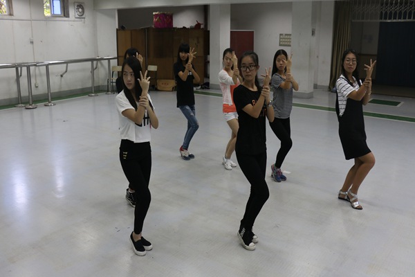 广场舞表演是由学前教育专业13级(2)班蔡安妮和学前教育专业14级(1)班罗慧颖带队。训练队的同学们伴随着音乐一遍又一遍的重复,一次又一次的练习。没有一个人喊累,没有一个人懈怠。中午本是午休的时间她们却在这里练习,汗水顺着脸庞滴下,她们却毫不在意。每一个动作都充满力量,每一段舞蹈都舞到极致。在她们眼中记者看到了对舞蹈的热爱。训练队同学灵活性感的舞蹈动作配合上欢快的舞曲充分展示了教科学子的青春风采,到处都洋溢着青春的气息。