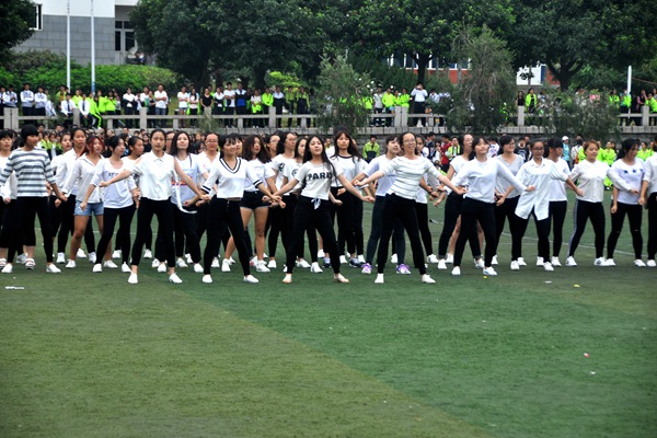 运动员们退场后,开始进行广播操比赛。14个学院在操场一字排开,伴随着广播操的音乐,场面一时壮观非常。操场上每个人的眼里都闪烁着坚定的光芒。我院的同学们穿着红白相间的衣服,摆手,下蹲,每个动作都富有张力,整齐一致,让人从心底里为他们叫好。广播操结束后紧接着就是广场舞,精彩的节目接踵而至,让人目不暇接。我院的广场舞为《Shake it》,欢快的音乐加上活力四射的舞蹈,进一步推动了现场的气氛。