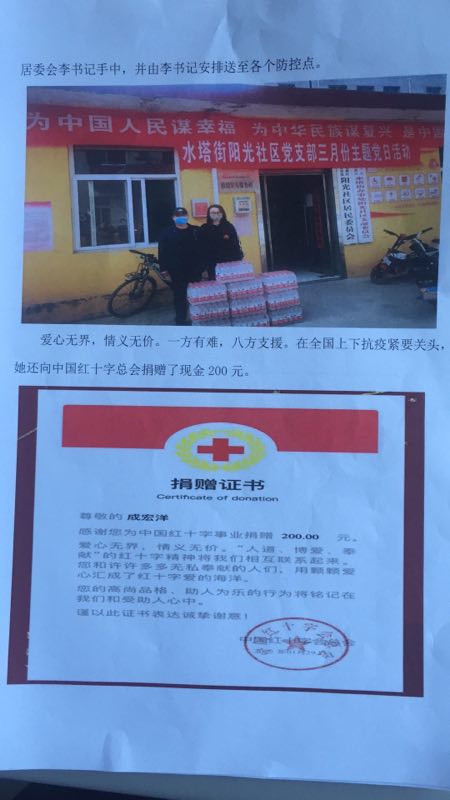 疫情期间,她工作认真负责,每天按时值班,及时上报社区居民体温测量的数据。其次,她还主动向居民发放防疫知识宣传手册并耐心解答居民的问题。成宏洋关爱社区居民,积极为社区服务,捐赠了10箱矿泉水。她关心国家,在全国抗疫紧要关头,她还向中国红十字总会捐赠了200元现金。