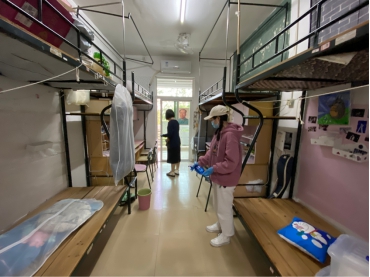 志愿者们佩戴好口罩、手套,进入宿舍后开窗通风,拿着消毒工具依次在宿舍门、洗漱台、地面、卫生间等地方喷洒消毒。