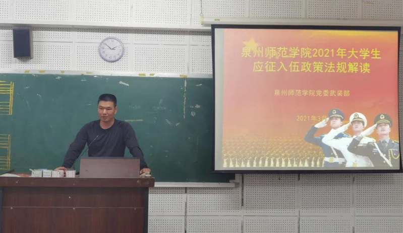 4月21日,军转干部朱绍东在艺术楼E101向20南音、闽台全体同学详细了解读大学生应征入伍的步骤、大学生入伍优待政策、退役大学生士兵安置、就业就学政策、参军入伍政治经济待遇等。朱绍东强调,国防事业需要每一个人的关心与支持,大学生入伍当兵是时代的召唤和科技、军事进步的客观需求,大学生入伍当兵将使人生阅历更加丰富。朱老师鼓励同学们响应祖国号召,积极应征入伍,为国防事业贡献自己的一份力量。
