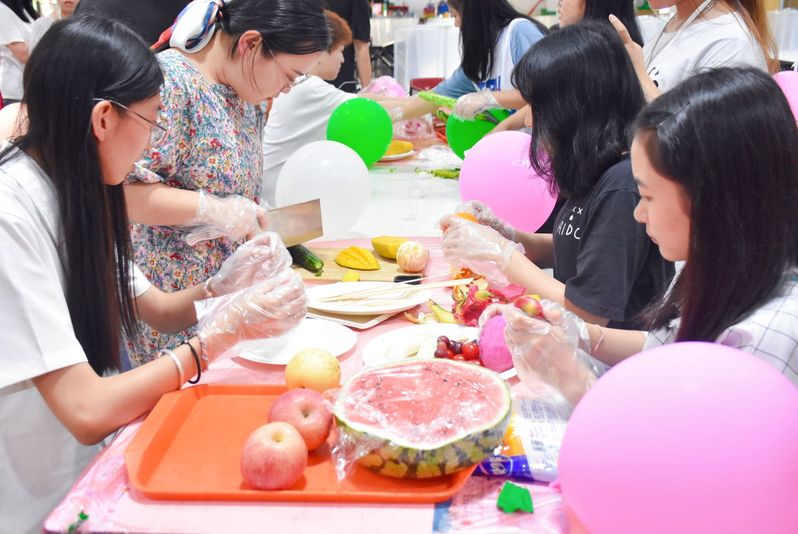 活动以“解手链”“一元五角”“传声筒”等小游戏暖场,营造热烈、活泼、轻松的活动气氛。随后进入本次活动的核心“水果大派对”水果拼盘活动。同学们充分发挥想象力和创造力,根据个人喜好和当下心情挑选水果,精致切分,巧妙拼合,创作创意水果拼盘。期间同学们相互交流创作灵感,碰撞奇思妙想,体会团结互助、守护相望的团队协作精神,感受生活乐趣,将本次活动的气氛推向高潮。最后,同学们纷纷在活动展板上书写感言,为本次活动画上一个圆满的句号。