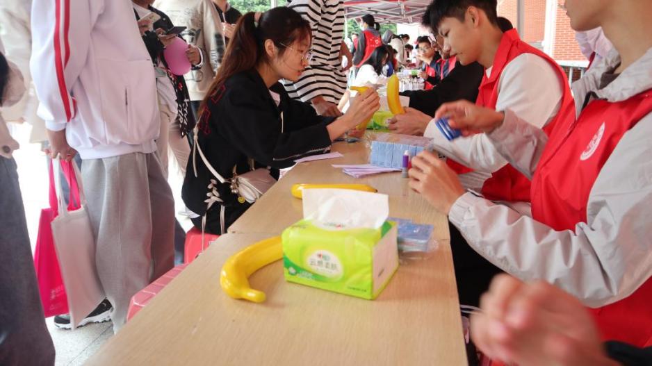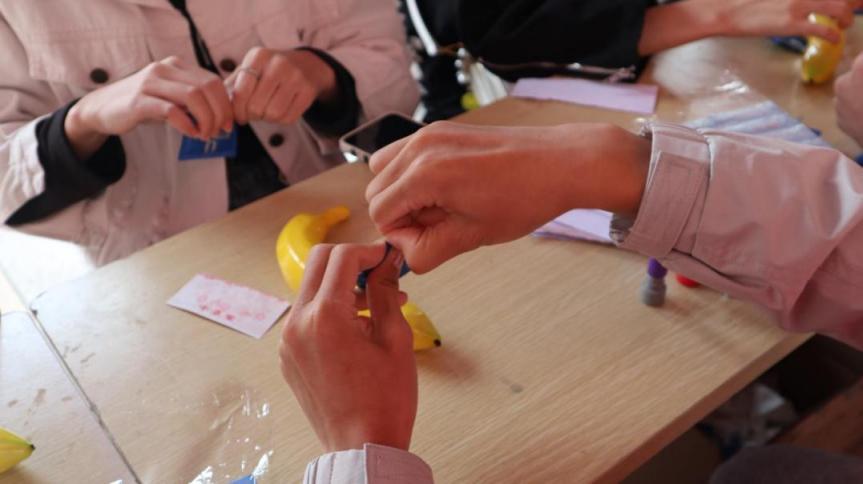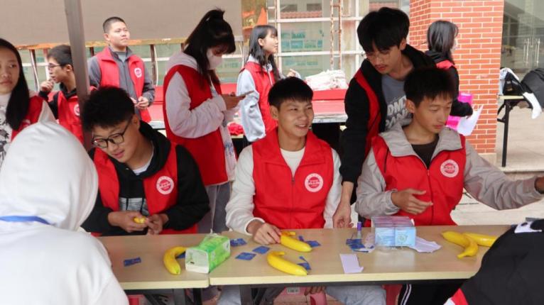 在模拟使用安全套教学中,志愿者们使用香蕉模具向同学们展示如何正确使用安全套,并邀请同学们动手实践,从而掌握在性行为中,有效预防艾滋病传播的方法。