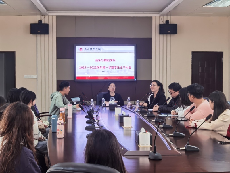12月17日,音乐与舞蹈学院在艺术楼C205会议室召开2021—2022学年第一学期学生主干会议。院党委副书记、纪委书记胡秋娇,学工办主任、团委书记刘晓莹,辅导员张甲玉、李祖阳以及学生会全体学生主干、各班班长、团支书参加本次会议。会议由院学工办主任、团委书记刘晓莹主持。