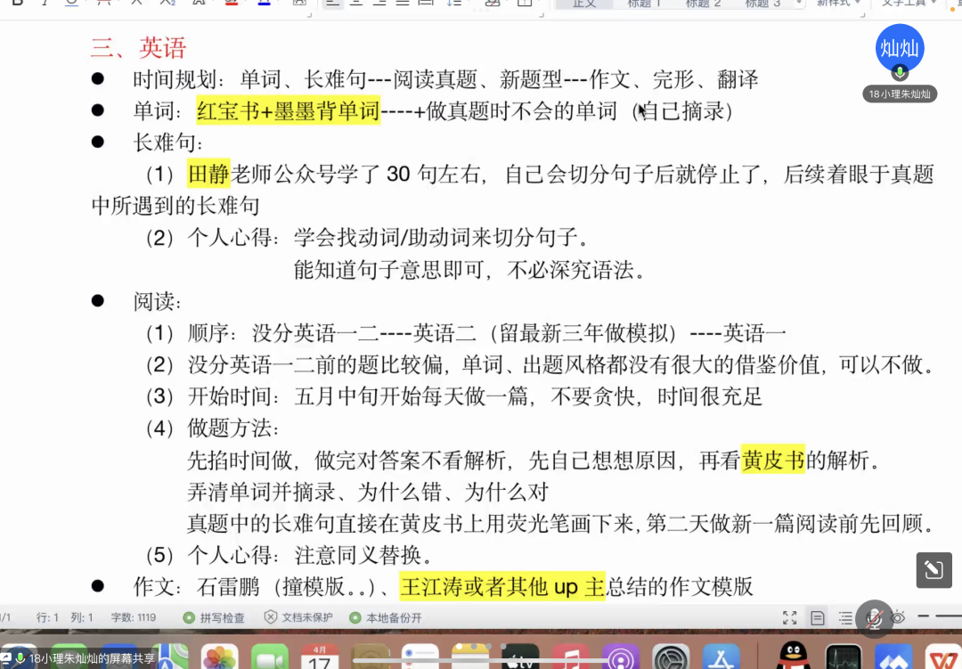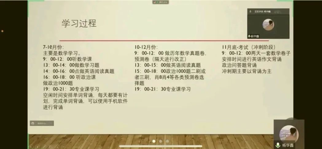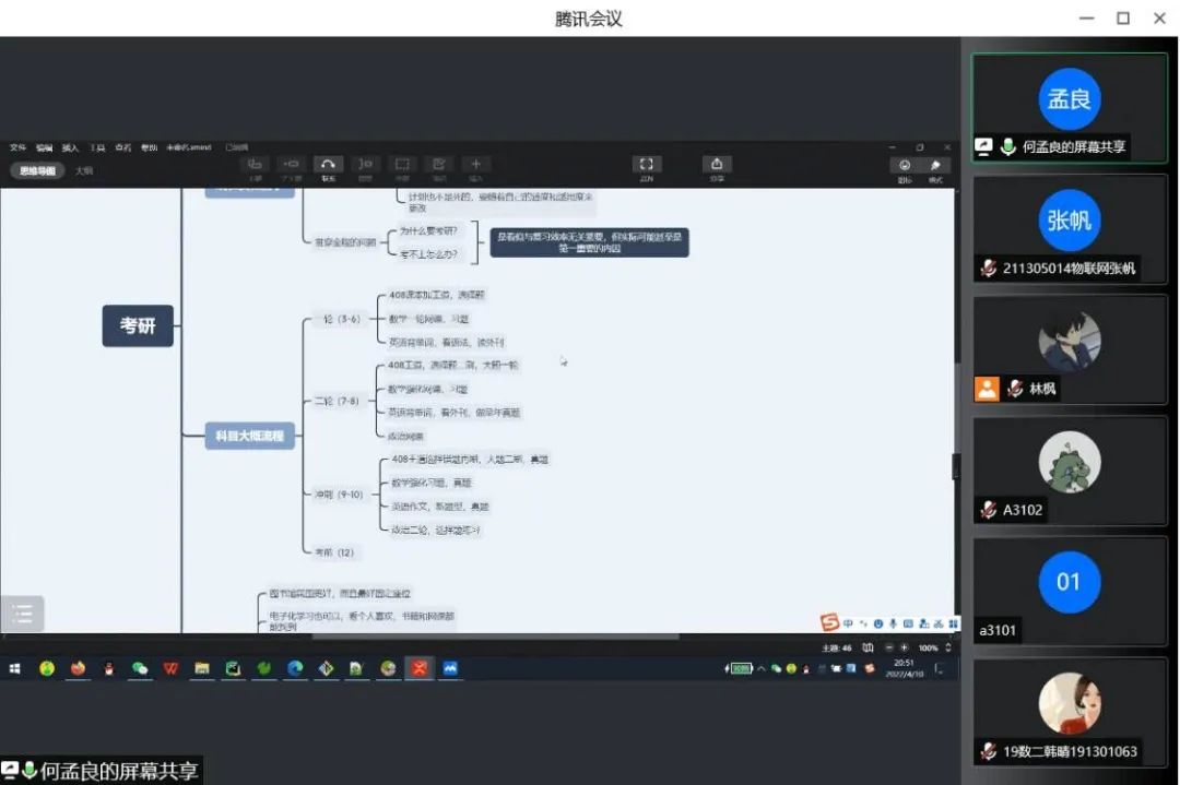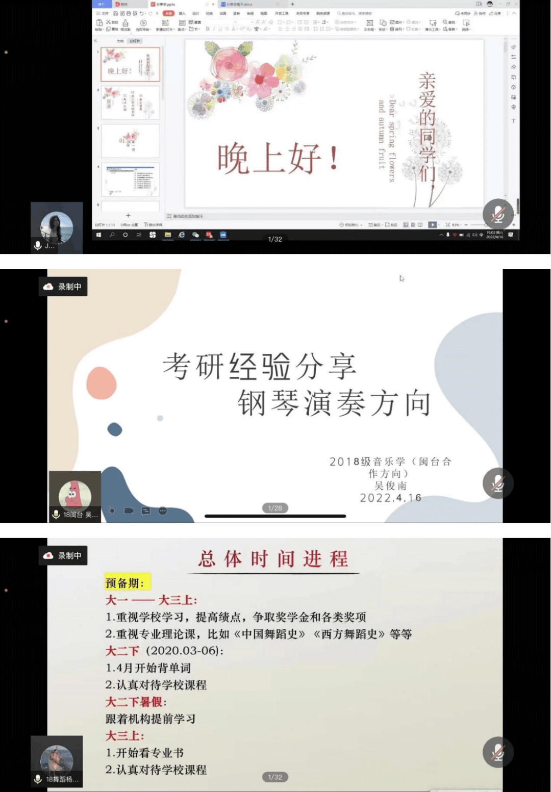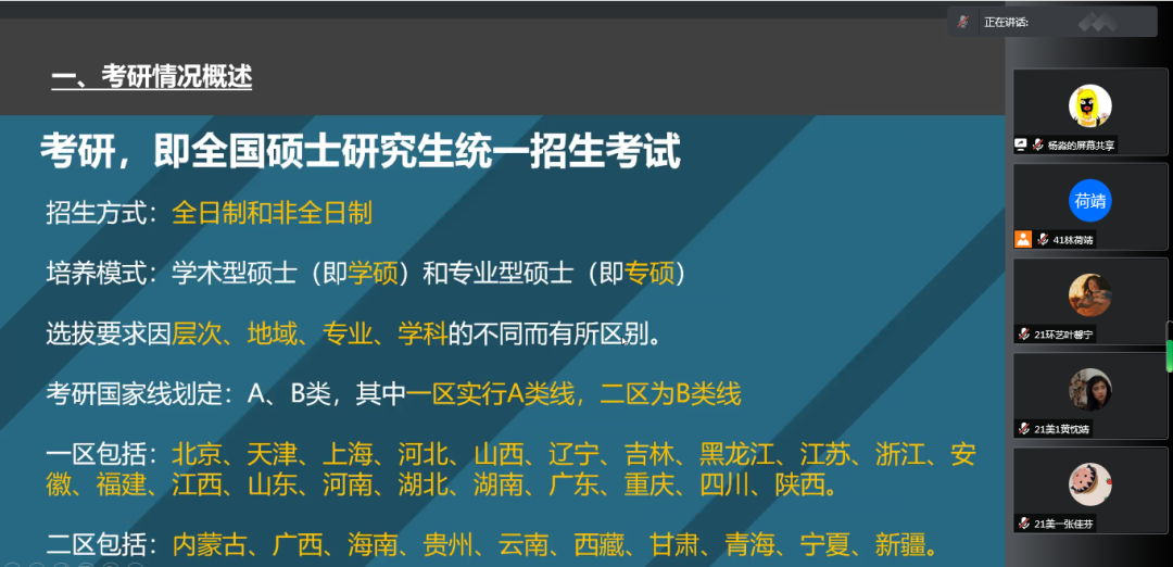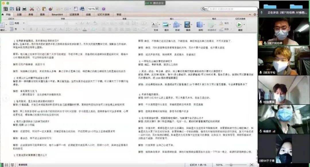 体育学院李星洋分享了“按部就班休息之道”以及高分法宝——刷题,并强调:放下娱乐,专心学习。音乐与舞蹈学院考研成功的同学则依次分享“如何制定考研复习计划”、“怎样搜集复习资料”、“如何尽快找到适合自己的复习方法”、“考研冲刺阶段该做什么”、“在复试中的注意事项” 等经验;参与线上分享会的外国语学院的同学们提出了有关考研的一些基本问题,例如:是否建议跨考、是否建议报班、建议选择专硕还是学硕、学习时间安排等,学长学姐们就这些问题给出了相关的宝贵建议,给予了同学们极大的帮助。