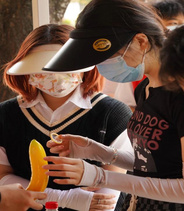 下面就是安全套教学环节啦。在教学环节中,我们不仅讲到安全套的正确使用,还提及一些安全套使用中容易被忽视的小问题哦,比如提前检查生产日期,以及按压检查包装是否有破损等等。虽然同学们在亲身示范的过程中,会有一点点羞涩,大部分同学还是很成功的完成安全套的使用呢。