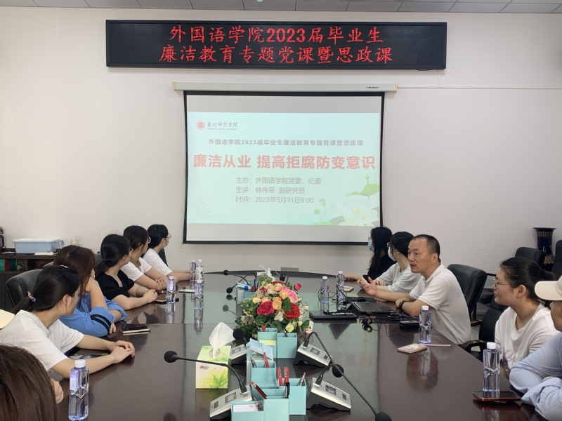 5月31日上午,一场别开生面的2023届毕业生廉洁教育专题党课暨思政课在外国语学院外文楼113室举办。这是外国语学院党委、纪委2023届毕业生廉洁教育专题系列活动之一。