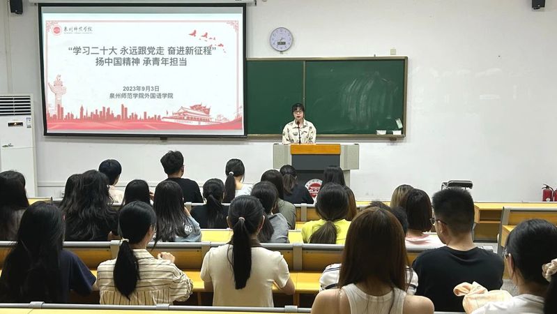 为深入学习贯彻习近平新时代中国特色社会主义思想,推动团员和青年认真学习领会党的创新理论,9月3日,外国语学院团委书记陈奕希开展了“扬中国精神 承青年担当”主题团课。