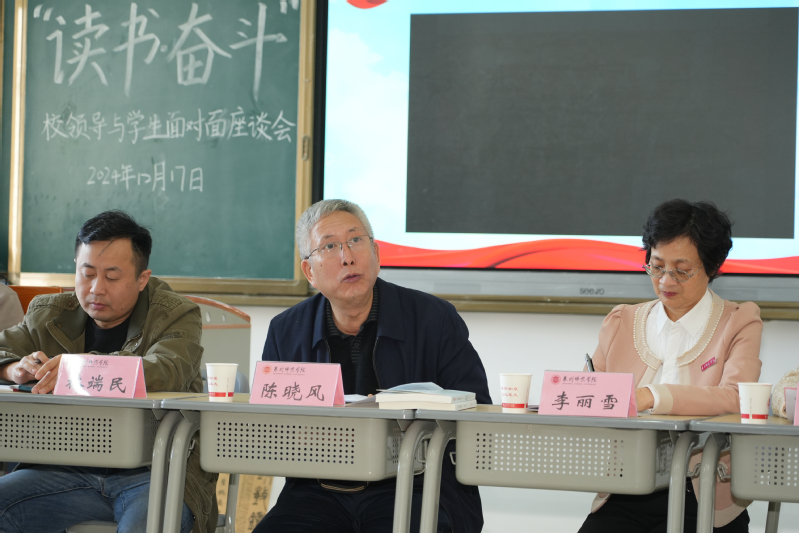 12月17日下午,文学与传播学院在俊秀304教室举办了一场温馨而深入的以“读书·奋斗”为主题的交流座谈会。校党委副书记陈晓风与学院学生第一党支部、挂联宿舍以及部分书法的学生代表围坐在一起,畅聊读书的心得和奋斗的体会。学院党委相关负责人以及辅导员参加此次座谈。