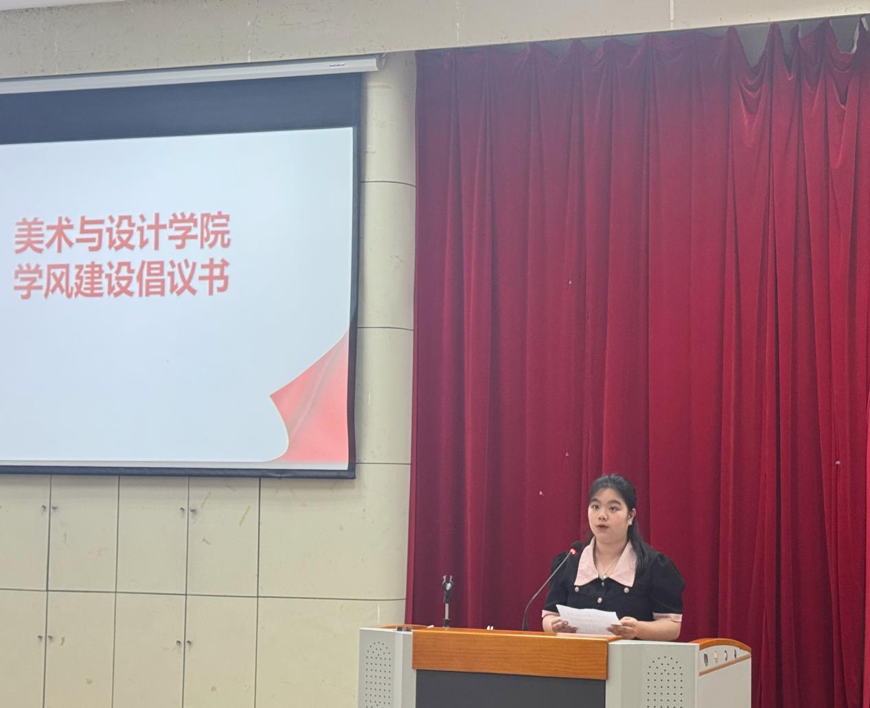 会上,学院学风建设学生代表柯晴晴同学宣读了《美术与设计学院学风建设倡议书》《美术与设计学院期末诚信考试倡议书》等。