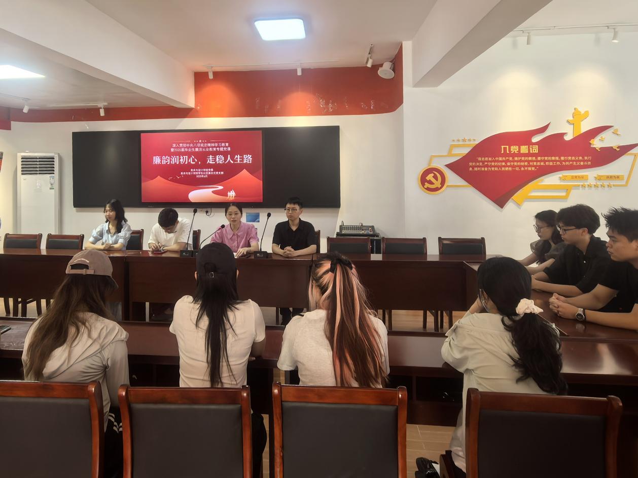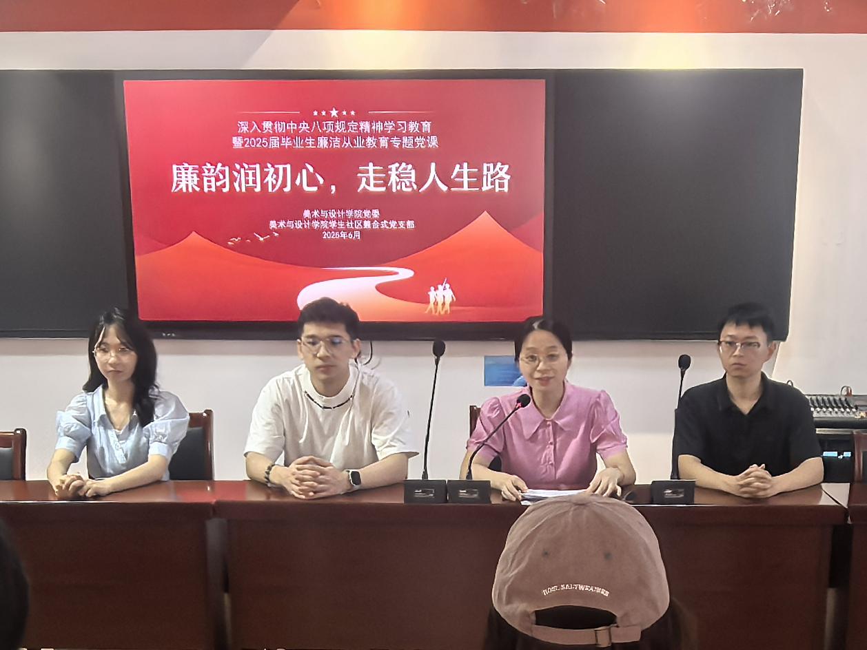 在2025届毕业生扬帆启航之际,6月19日上午,美术与设计学院党委副书记兼纪委书记、院学生社区兼合式党支部书记白雅芬,在C区“一站式”学生社区讲授深入贯彻中央八项规定精神学习教育暨2025届毕业生廉洁从业教育专题党课,为毕业生党员筑牢思想堤坝,注入清廉动能。院学生社区兼合式党支部委员骆泊屹、严恺、李颖及部分毕业生党员代表参加。