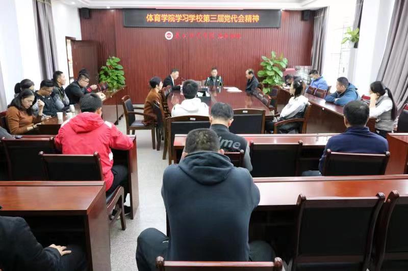 11月22日上午,体育学院在伟利体育馆二楼会议室召开体育学院党委理论学习中心组学习会议,深入学习贯彻学校第三次党代会精神,会议由学院党委书记卢进民主持,院领导、各党支部书记参加。12月9日,在伟利体育馆二楼会议室召开全体党员会议,深入传达学习学校第三次党代会精神。