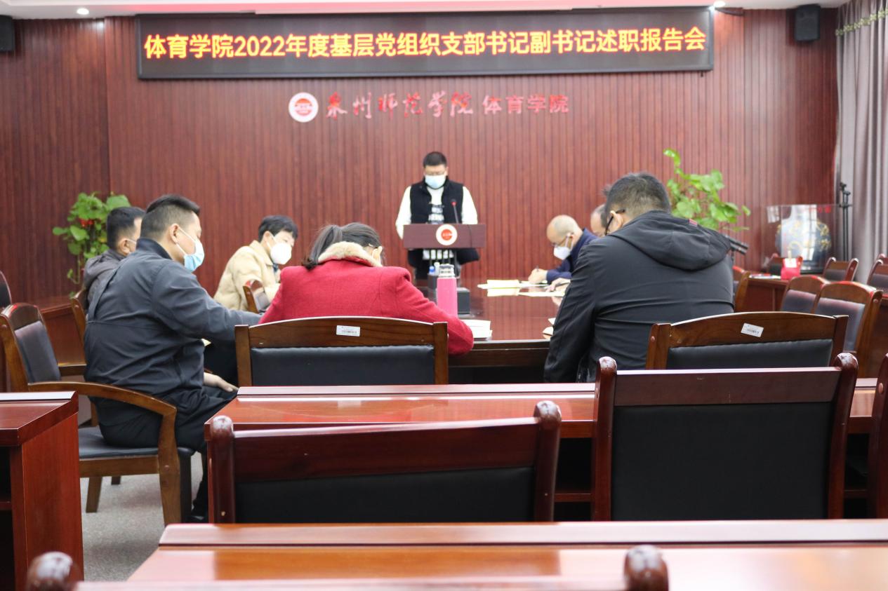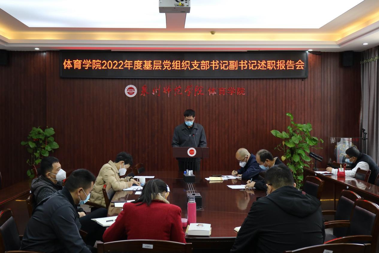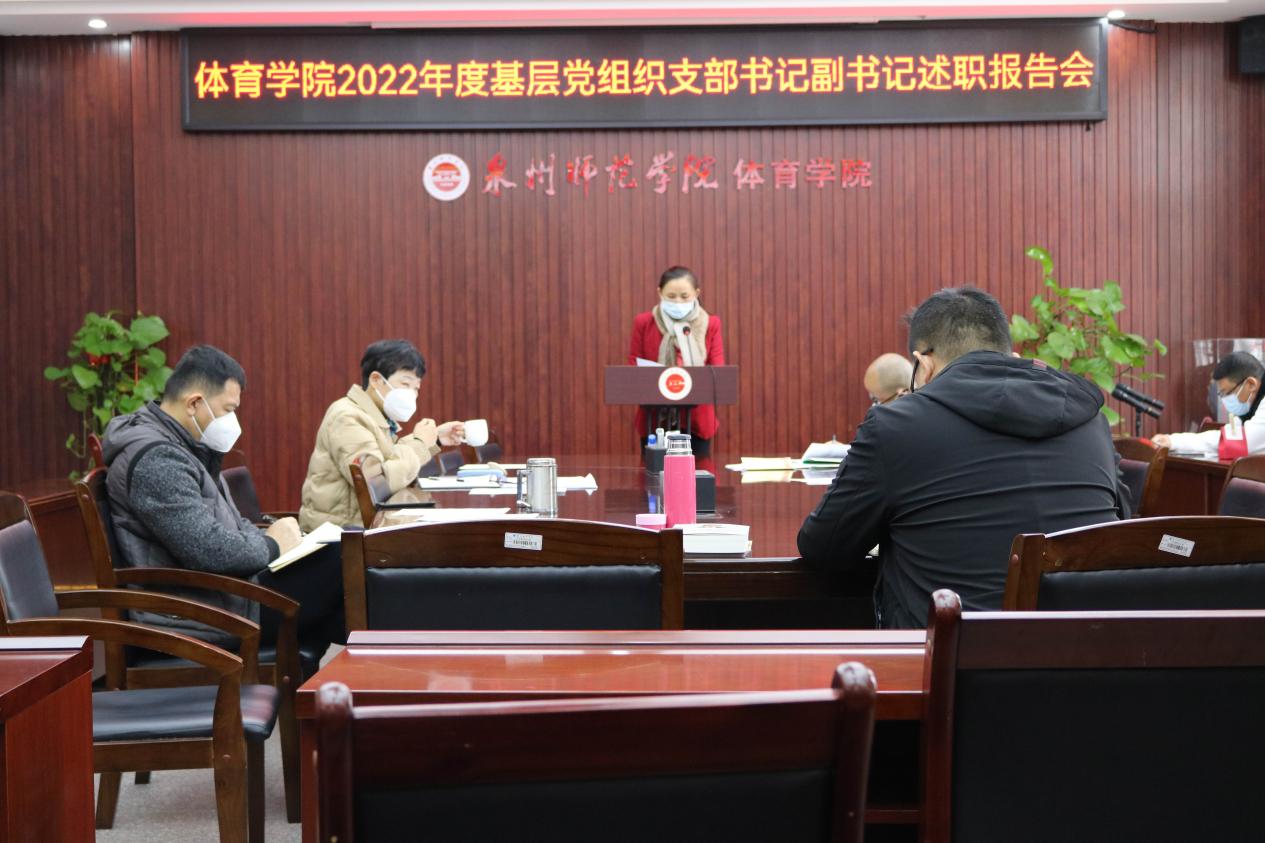会上,各基层支部书记的述职内容主要围绕过去一年的工作开展情况,自我剖析党建工作中存在的问题,提出下一步工作思路和实施的具体措施。与会的学院领导根据会议述职和平时了解掌握的情况,对各支部开展的工作一一进行点评,并提出要求。学院各领导对4名基层党组织党支部书记党建工作述职充分肯定一年以来的工作成绩,尤其是各支部在年初抗击新冠肺炎疫情所做出的努力和贡献,同时也指出了学院基层党建工作中存在的不足和今后需要努力的方向,结合学校和学院2022年党建工作基本情况,就进一步抓好基层党建工作提出明确要求:一是要提高思想政治站位,要以党的二十大召开为契机,进一步深入学习贯彻习近平新时代中国特色社会主义思想,把加强党的领导放在首位,牢固树立“抓党建是最大主业”意识,把党建工作落到实处,把工作做实做细;二是要加强党建与专业建设相结合,充分利用“三会一课”制度,围绕教学、科研、学生管理、对外交流和社会合作开展党建工作,更好地将党建与体育各专业有机融合,不断拓宽体育学院院基层党建工作新渠道,结合体育学院的专业特点,注重挖掘亮点,凝练党建品牌,彰显支部特色;三是要进一步提高各支部工作的积极性和主动性,化被动为主动,能担当敢作为,各党支部书记要发挥好领头羊的作用,加强支部立项工作,让基层党组织充满活力,充分发挥党员先锋模范作用。