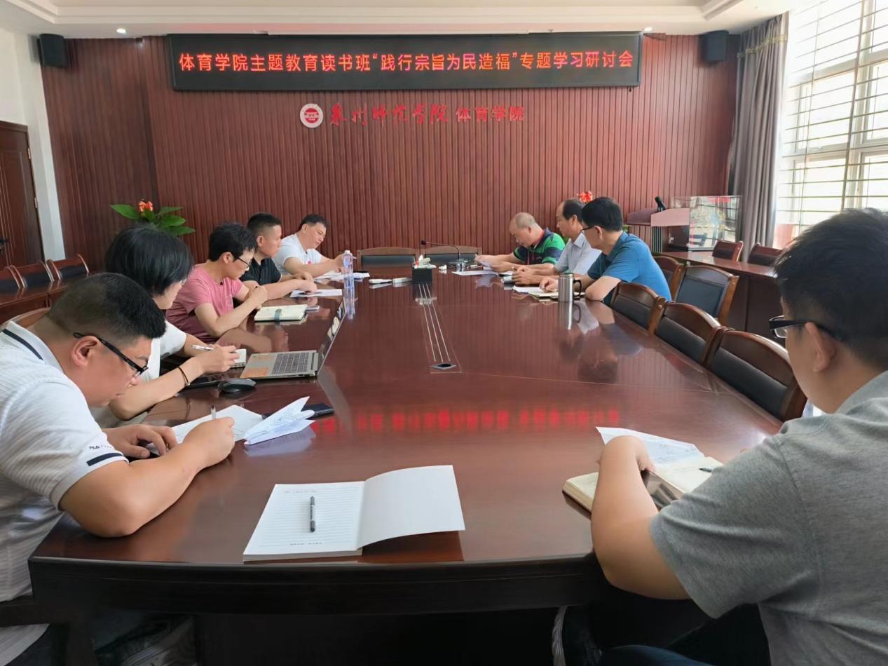 6月19日上午,体育学院主题教育读书班“践行宗旨为民造福”专题学习研讨会在体育学院201会议室举行。体育学院党委委员、党支部书记、三办主任和党委组织员参加会议。学院党委班子成员结合个人自学,围绕“践行宗旨为民造福”开展专题学习研讨。体育学院党委委员、副院长王伯余作主题发言,王伯余强调,践行宗旨为民造福——着力在建新功,重点是教育引导全院党员、干部坚持一切为了师生、一切依靠师生,自觉问计于师生、问需于师生,以“时时放心不下”的责任感、积极担当作为的精气神奔着问题深入实际、深入基层、深入师生紧盯问题开展调查研究,和当前正在推进的重点工作结合起来,找准切入点、发力点,形成对策措施,切实推动问题解决。