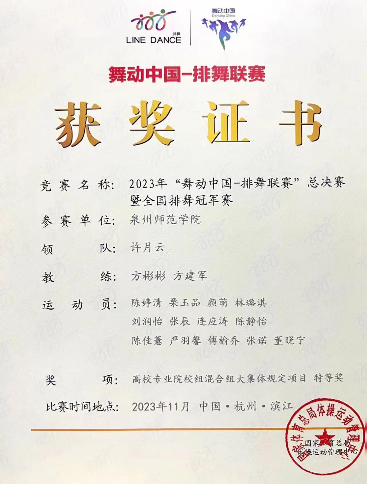 11月9日至11月13日,由国家体育总局体操运动管理中心、中国蹦床与技巧协会、杭州市滨江区人民政府主办的2023年“舞动中国-排舞联赛”总决赛暨全国排舞冠军赛在杭州市滨江体育馆举行。我校派出16名学生参赛,经过激烈的角逐,最终斩获高校专业院校组混合组大集体规定项目特等奖,初级串烧项目一等奖,自选项目一等奖,高校专业院校组团体第二名的好成绩。教练员方彬彬老师连续3年被评为全国排舞推广大使。