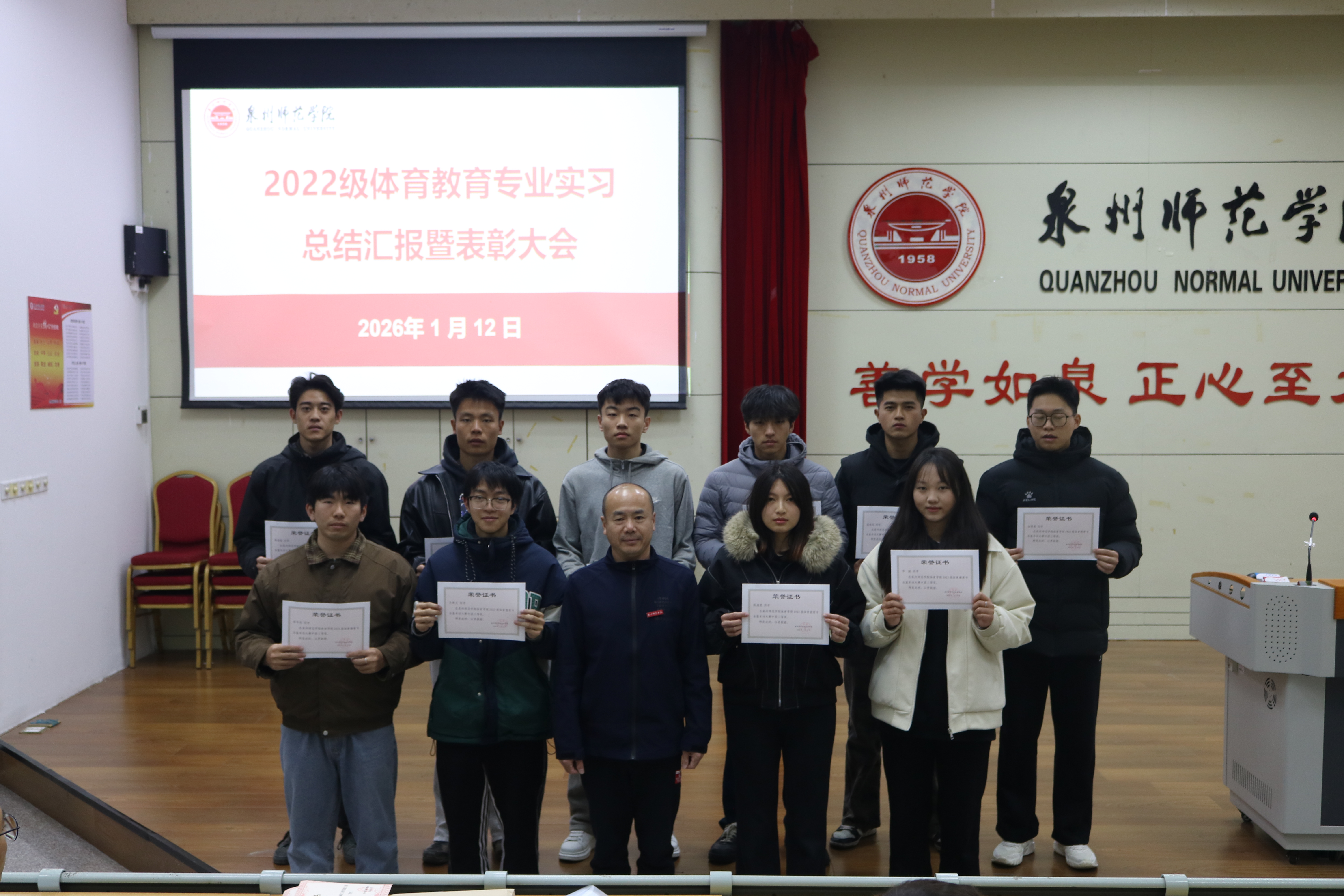 为进一步推进体育学院教育教学改革发展,总结2022级体育教育专业教育实习工作成效,表彰实习过程中涌现的优秀个人与先进典型,2026年1月12日,体育学院召开2022级教育实习总结表彰大会。院长许月云,党委书记郑少君,教学科研办主任郑婷婷,学工办副主任林增辉,各实习带队老师,全体辅导员,2022级体育教育专业学生及2023级体育教育专业学生参会,会议由体育教育专业副主任徐敏主持。