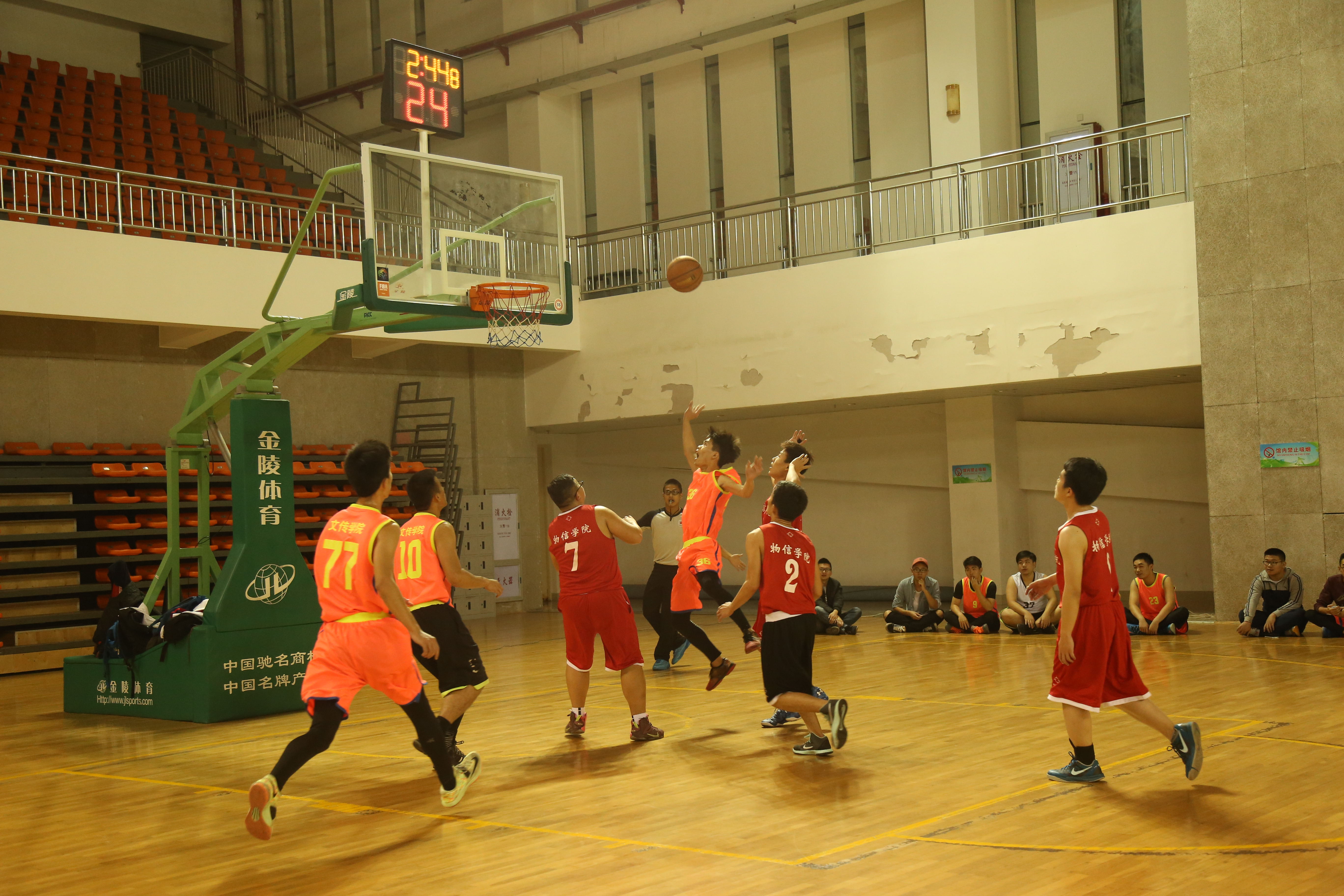 比赛哨声一响,我院选手占得先机,顺利拿下两分。接着,球员们信心大满,连连进球,暂时拉开比分。物信队员也不甘落后,接连得分,分数追赶十分激烈。我院选手势如破竹,14书法梁钟文身手敏捷,灵活截球,迅速躲闪对手,几番扣篮成功。14文一黄志投篮精准,多次抢球并接连得分。13广告丁宏锰擅长接球跳投,冲破对方重重阻挠,上篮进球。上半场结束时,我院以30:32领先物信2分。