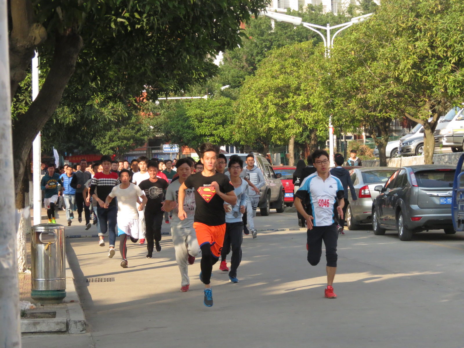 A区门口选手们蓄势待发,当枪声响起时,选手们应声起跑。体院选手凭借自身优势一马当先,轻松领跑队伍。我院选手调整呼吸、迈稳步伐、向前奔去,陆续经过文科楼、荣茂楼前、钟楼、图书馆、档案馆、理工楼、理工篮球场、明德体育馆、C区外围等地。此时,约2.5千米的路程已跑过一大半,我院有些选手体力不支,速度渐渐减慢,但是他们并没有放弃,仍继续向前奔跑。在慢跑的过程中,他们调整呼吸、匀速奔跑。当比赛接近终点时,我院选手加快步伐,顺利抵达终点。