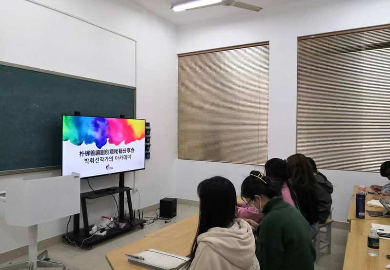 本次沙龙由乐正传媒国际节目模式部总监杜萌主持,通过腾讯会议在线直播,并配备交传翻译。朴辉善用90分钟详细分享了韩国综艺剧本的创作过程,包括各类型剧本的核心侧重点,制作好剧本的基础素材提取法。在后续60分钟的问答环节中,针对听众提到的关于综艺创作灵感来源、优秀综艺编剧素质养成、制作现场的应变等各种问题一一解答。沙龙全程近2个半小时,全体参与沙龙的研究生始终聚精会神收听、记录。