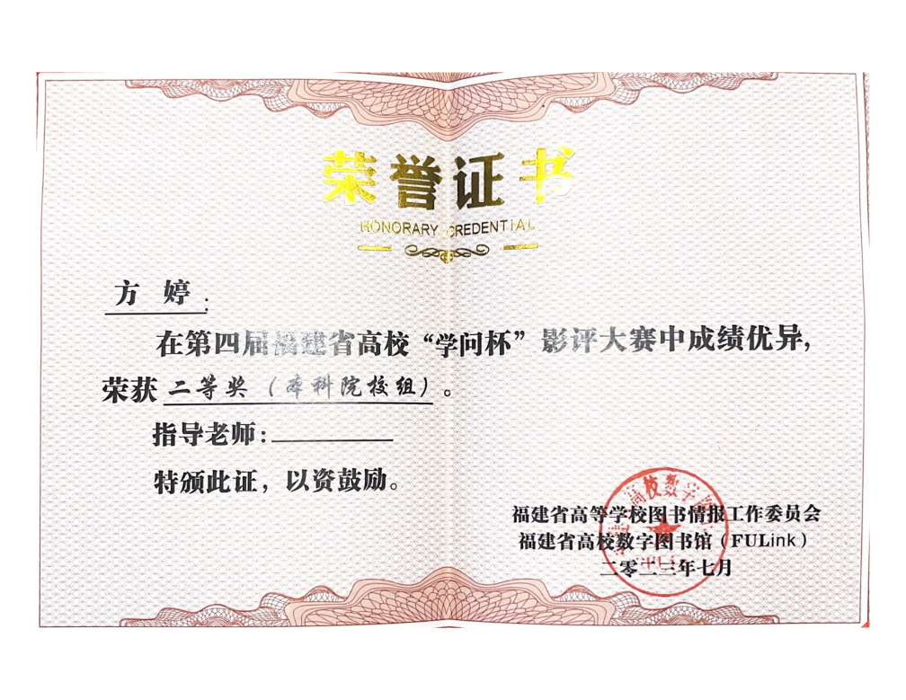 经各校初评、专家复评,第四届福建省高校“学问杯”影评大赛获奖结果于日前揭晓,文传学院中文系汉语言文学专业2020级方婷同学撰写的影评《〈少年派的奇幻漂流〉的理性与信仰》喜获二等奖。