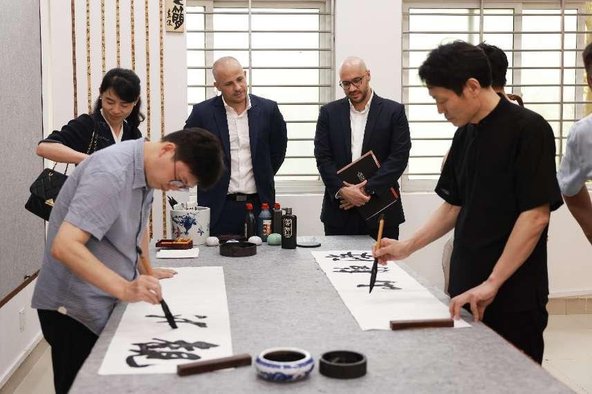 图为书法系王守民、欧阳军两位老师现场为来宾展示优秀中华文化书法艺术