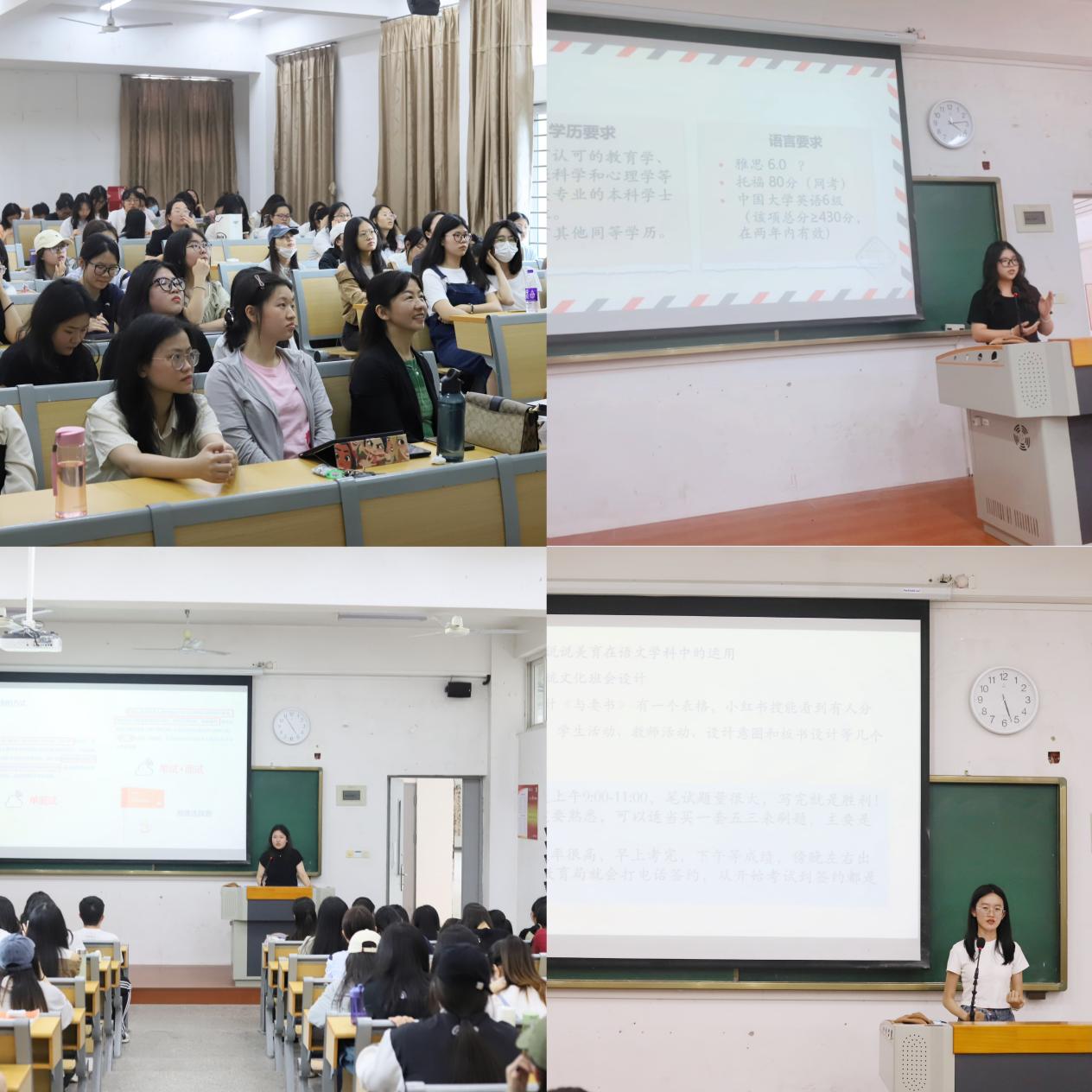 据统计,2024届汉语国际教育系考研、考编成果丰硕,喜报频传。分享会邀请获得各校硕士研究生录取资格和顺利考取教师编制的毕业生上台分享自己的考试经验。当日,分享会座无虚席,现场气氛热烈。专业主任王曦博士致开场辞,对2024届学生的考研、考编成果做出充分肯定,对2021级和2022级学生表示鼓励和期许。会上,全国大学生自强之星荣誉获得者江晓芬、院学习部部长翁舒婷、2020级汉教专业班长陈恬等优秀毕业生根据自身经历,将分享内容分为考研、留学申请、考编三个部分,围绕备考计划安排、实用备考工具、备考心态调整、考试策略等方面展开详细讲解,并为现场学弟学妹送上诚挚的祝福。在场同学深受鼓舞,从一个个成功案例中获得了备考指导,也对自己的未来规划有了更加明确的方向。最后,支部书记洪盈莹老师做总结致辞,对前来分享的毕业生表示感谢,同时号召专业全体同学向优秀的毕业生学姐们学习。
