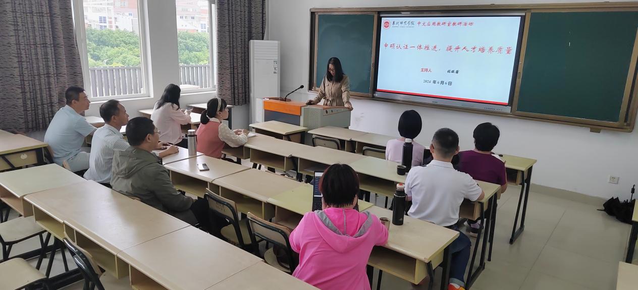 为了落细落实“申硕认证一体推进,培养拔尖创新人才”总体战略构想,充分发挥福建省高校课程思政优秀教学案例“凝练闽南意象,讲好海丝故事”示范引领作用,文传学院中文应用教研室按照上级统一部署,于6月6日下午在俊秀文学院东楼305教室,专题研讨“何以为师 行见山海”实践教学体系建设。本次活动由教研室主任张婉霜博士主持,全体归口教师、在学研究生(含联合培养硕士生)、高年级本科生代表参加,校级督导员颜莉莉副教授、院级督导员通拉嘎副教授亦莅临现场指导。
