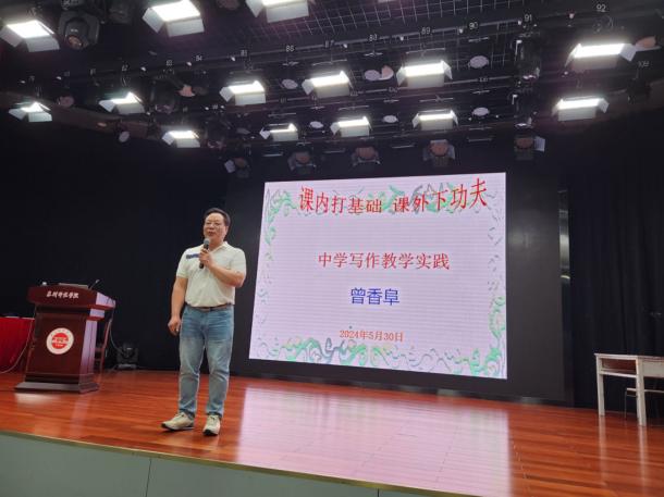 曾香阜老师则在《中学写作教学实践》的演讲中结合自身从教经历,从“师容、师德、师才”三要素入手,而将写作教学阐释为一项“明师工程”。其认为:“明智”之师是初级阶段,主讲教师要注重教法学法,挖掘授课对象的写作潜能;“明理”之师是中级阶段,应围绕“文理、事理、情理”三个维度,做到“文道统一”、以“文”服众;“明心”之师是高级阶段,需涵养学生创作“情怀”,进而提升作文“格局”。