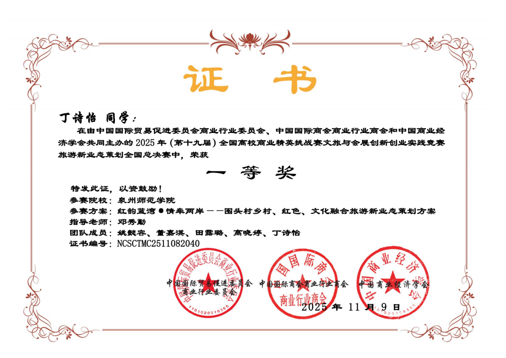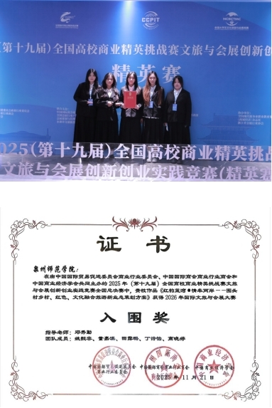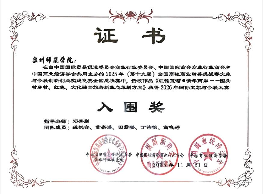 11月21日至24日,第十九届全国高校商业精英挑战赛文旅与会展创新创业实践竞赛全国总决赛精英赛在浙江金华永康隆重举行,姚懿容、丁诗怡、董嘉淇等同学到现场参加总决赛。作品《红韵蓝湾·情牵两岸——围头村乡村、红色、文化融合旅游新业态策划方案》斩获全国一等奖,并入围2026年国际文旅与会展大赛。该作品围绕“围头村”乡村文旅融合创新发展展开策划,由22级广告学(闽台合作)专业姚懿容同学、23级广告学(闽台合作)丁诗怡、董嘉淇同学共同参与创作完成。