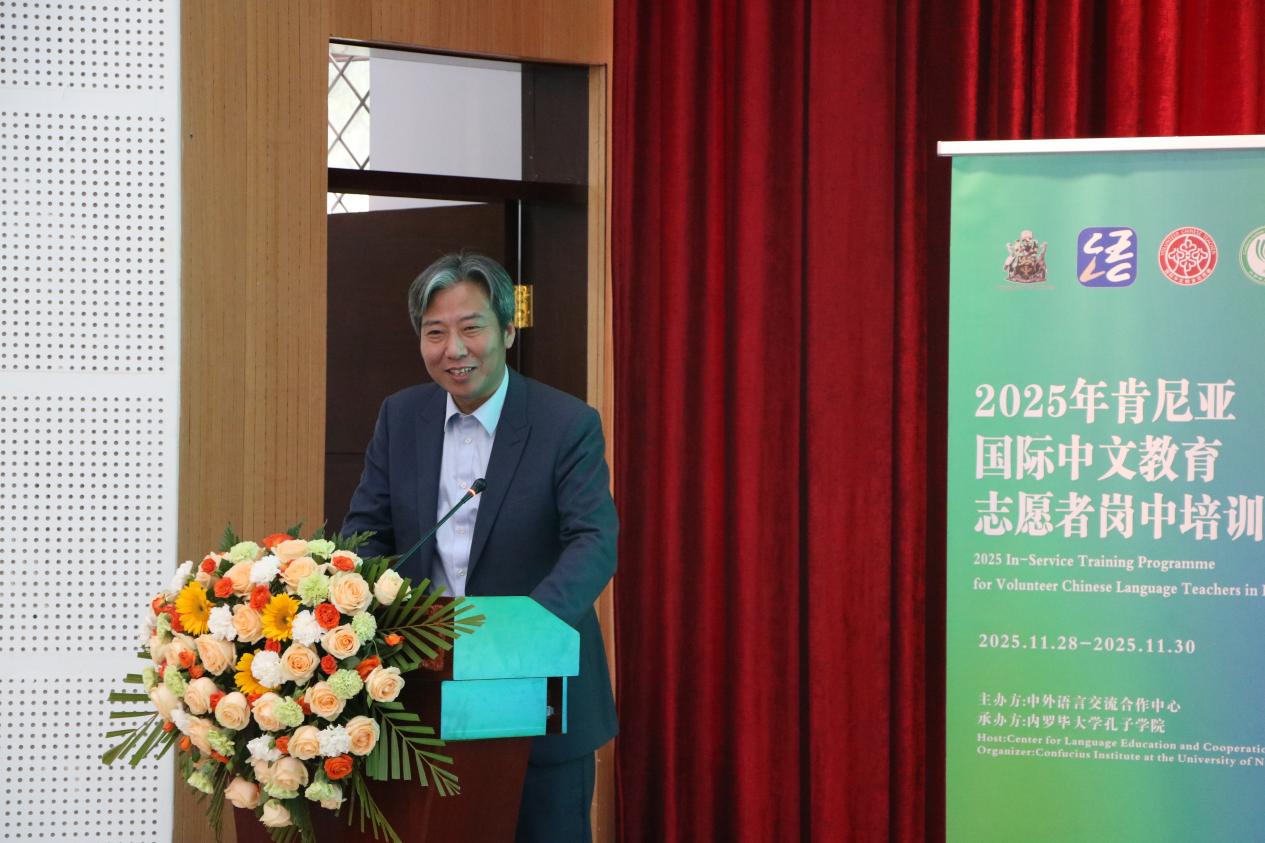 2025年11月30日,在肯尼亚内罗毕大学孔子学院举行的“2025年肯尼亚国际中文教育志愿者岗中培训”结业仪式上,我院三名学生——熊舒婷、朱晋佑、梁梓卓,受到教育部中外语言交流合作中心(以下简称“语合中心”)主任郁云峰先生的亲切接见,体现了国家对国际中文教育青年实践力量的高度重视,也是我院深化人才培养国际化、服务国家语言文化传播战略的生动缩影。