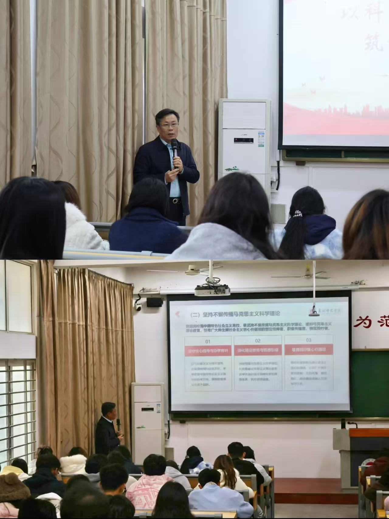 授课中,林建全书记围绕马克思主义宗教观的核心要义,系统解读了宗教的本质特征与我国宗教政策的精神实质。同时紧扣“精神筑防线、行动明界限、认知辨是非”三个维度,结合典型案例,深入剖析宗教渗透的隐蔽形式与现实危害,引导同学们对宗教信仰树立正确认识,并指出要以“三个警惕”“两个不得”“五个严禁”为遵循,将正确观念落实到具体行动中。林建全书记强调,马克思主义宗教观是正确认识宗教的“总钥匙”,宗教信仰自由不等于传教自由,校园内禁止开展与宗教相关的一切活动。他希望同学们用马克思主义科学理论武装头脑,在大学四年明确目标、锤炼本领,努力成为担当民族复兴大任的时代新人。