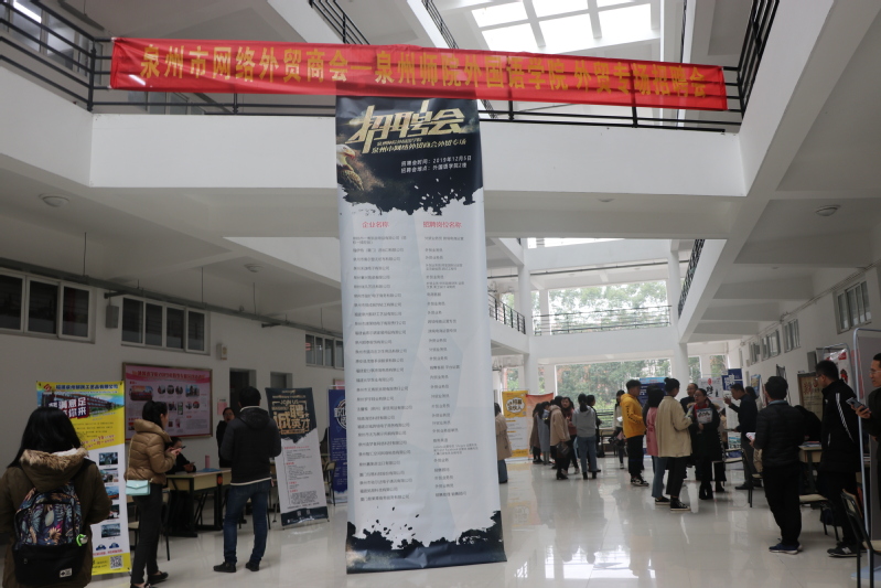 2019年12月5日下午,外国语学院于外文楼二楼大厅举办了由泉州市网络外贸商会主办的外贸专场招聘会。此次招聘会由包括泉州市一博旅游用品有限公司、泉州瑞凡艺品有限公司、泉州顺泰服饰有限公司等在内的33家企业参加,为2020届毕业生提供了外贸业务员、跨境电商运营专员、商务英语等数十个热点岗位。