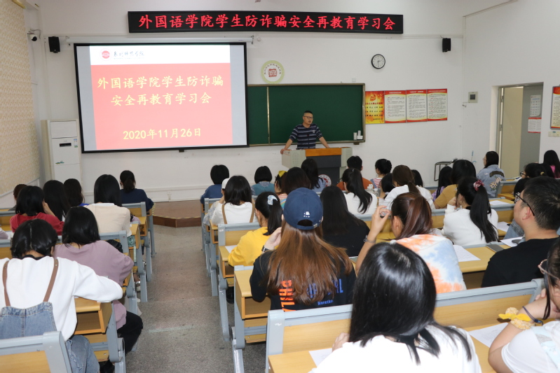 为增强学生的防诈骗安全意识、普及防诈骗安全知识并提高学生自我安全保护能力,11月26日下午,我院于外文楼112教室召开学生防诈骗安全再教育学习会。大会由院党委书记蒋双霖老师主讲,全体辅导员参加大会,我院各宿舍舍长到场学习。