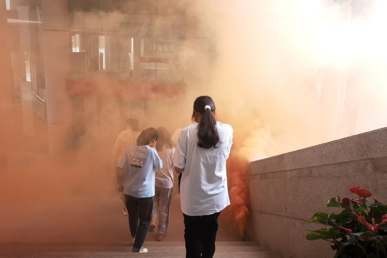 事前,为使演练更加形象、逼真,从消防演习所用的烟雾到发动号令的喇叭,老师和同学们精心布置,场地设施等一切准备就绪。演练伊始,学生干部代表向在教室里等待的各位同学强调了几点注意事项:一是要保证楼道通畅,方便师生们逃离火灾模拟现场;二是逃生中师生们要捂住口鼻,低姿快跑;三是参加演习人员要听从指挥,认真配合,在疏散过程中,做到两人一排,相互照顾,切记不能拥挤,以免造成踩踏事故。随后,随着警报的一声拉响,同学们手掩口鼻,快速、安全、有序地穿过模拟火灾现场,整个过程有条不紊的进行着。演练过程中,同学们沉着冷静,听从指挥,在学生干部与老师的指导下自行成队,有序逃离模拟火场。师生们快速到达安全地点后,陈杰松老师对本次演习进行了总结,并宣布疏散演练活动在师生们的配合下取得了圆满的成功。