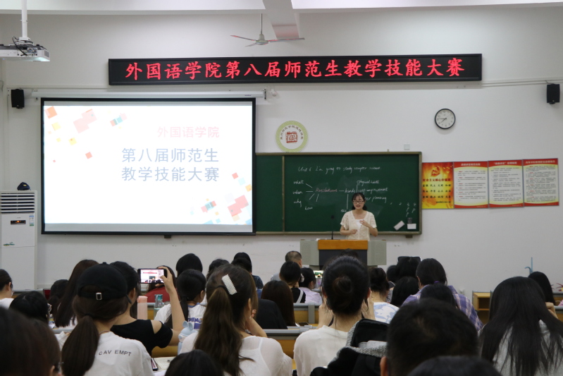 为锻炼师范生的实践应用和创新能力,进一步提高师范生教学技能水平和就业竞争力,我院第八届师范生教学技能大赛于5月23日下午七时许在外文楼112教室举行。此次技能大赛由我院学生张亚栋和陈伟虹主持,吕文谦、蔡岚岚、单斐娴以及曾旭暾老师担任评委,参赛选手主要为我院2018级英语(师范类)学生。