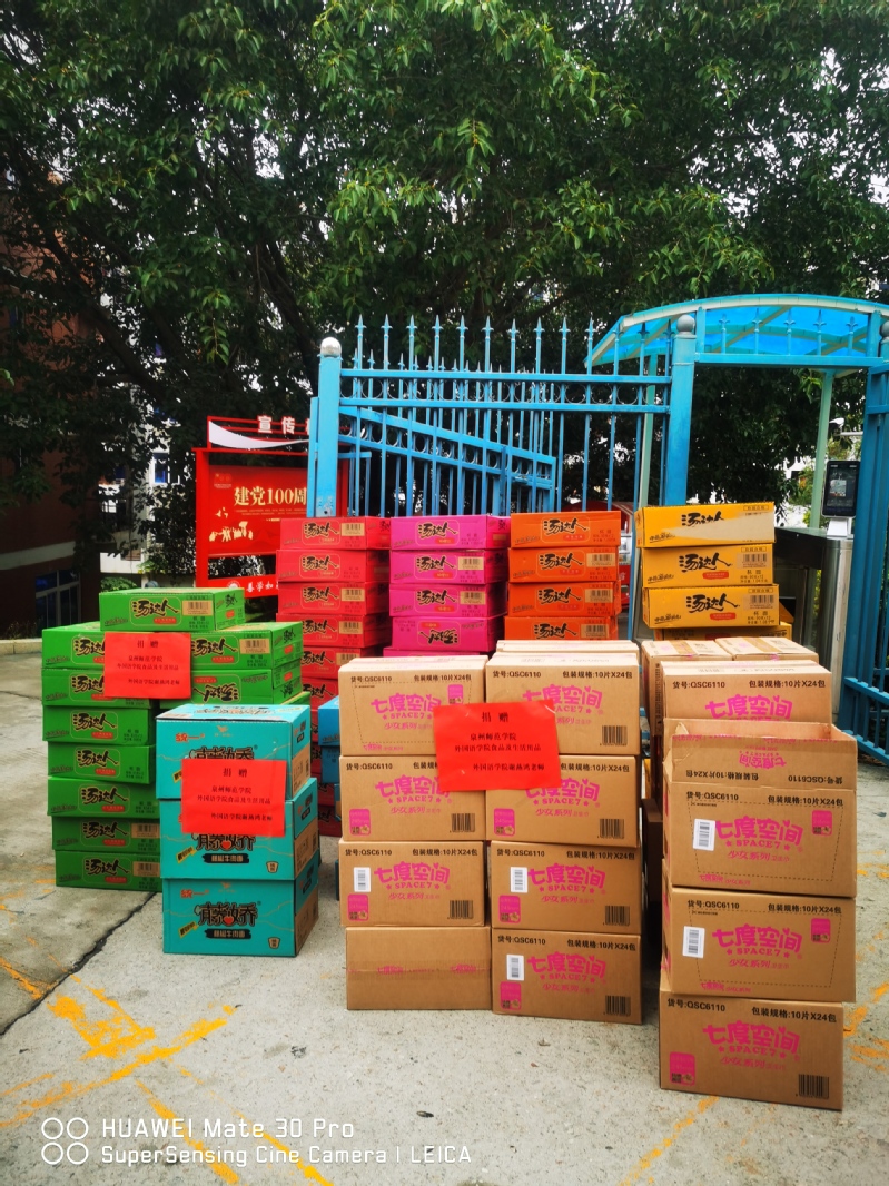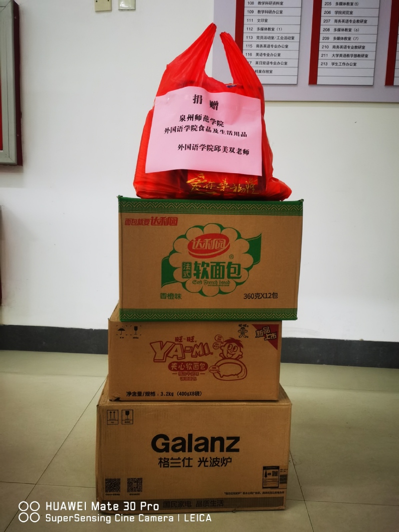 在捐赠物资中,黄诗海老师捐赠了60套医用防护服、60套面罩、60套手套、60套鞋套;谢燕鸿老师捐赠了七度空间卫生巾700包、汤达人750杯;邱美双老师捐赠微波炉一个、面包一箱、雨衣28件。