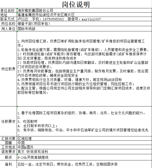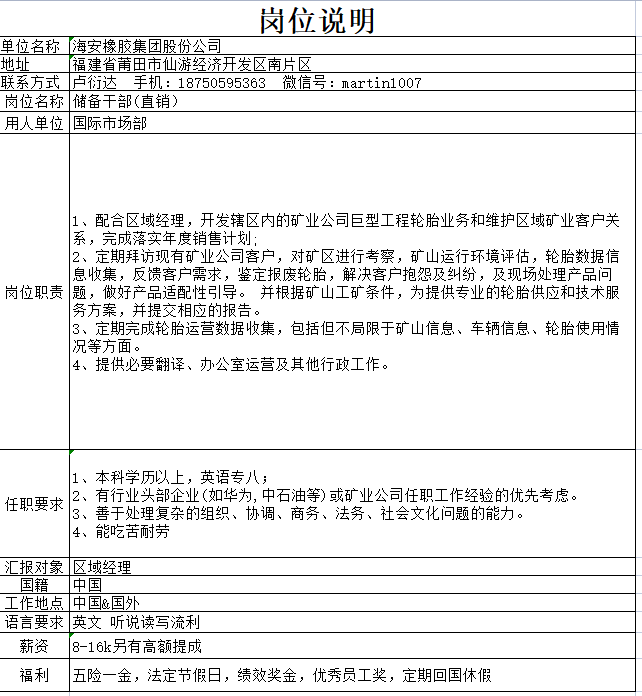 海安橡胶集团股份公司 储备干部岗位说明