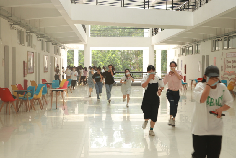 演练伊始,保卫处人员点燃烟雾弹并拉响火灾报警,紧接着,指挥人员立即指挥学生捂住口鼻,从最近的通道、楼梯、出口有组织、有秩序地安全撤离,伤员则在二楼外展厅出口处等待学校消防人员救助。撤离完毕后,立即落实安全撤离人数,并将情况层层汇报,最终向领导小组组长报告撤离情况。随后,演练及观摩人员在指定地点集合后,由保卫处副处长肖文清进行总结讲评,他先对全体同学的演练表现进行了表扬,然后强调在灾害面前,要有一颗平静的心来应对,更要了解一些常识性的逃生方法、急救方法和措施,呼吁全体师生对预防火灾保持高度重视。