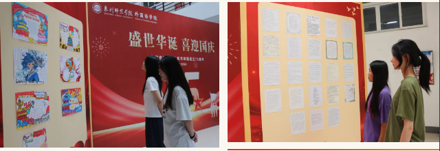 9月20日至10月10日,外国语学院举办“青春献礼新中国,奋楫扬帆谱新篇”国庆系列活动,庆祝新中国成立75周年。活动将专业特色与国庆主题巧妙融合,涵盖书法艺术、手抄报设计以及手工艺制作等多个方面。以翰墨飘香迎华诞、以丹青映彩庆华章,寓言于物、明志寓情,让“花式”劳动课走入学生心田。9月28日,筛选30幅书法、手抄报优秀作品于外国语学院二楼大厅进行了展出,吸引了众多师生驻足观赏。