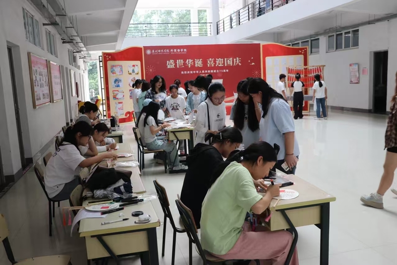活动期间,同学们积极参加书法和手抄报征集活动,将专业特色与国庆主题巧妙融合,用文字、绘画等独特形式表达对祖国的赤诚之心与衷心祝愿。9月28日,学院筛选出48幅优秀作品于外国语学院二楼大厅进行了展出,吸引了众多师生驻足观赏。10月10日下午,学院于外国语学院二楼大厅举办了“逢盛世,谱华章”手工艺创作活动,现场同学们参与团扇制作,将传统文化与现代创意相结合,体验传统艺术的独特魅力,还在书签上书写祝福语或励志名言,以书签寄语的形式,表达自己对祖国的美好祝愿。