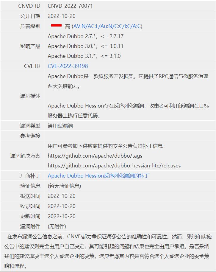 【风险提示】关于Apache_Dubbo服务存在反序列化漏洞的风险提示