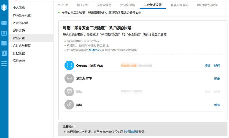 启用二次验证后,除网页端依然使用邮箱密码登录外,其他的登录方式如POP3、IMAP、SMTP以及Foxmail、Outlook、手机邮箱客户端等,必须使用客户端安全密码才能登录。类似于QQ邮箱的客户端授权码功能。