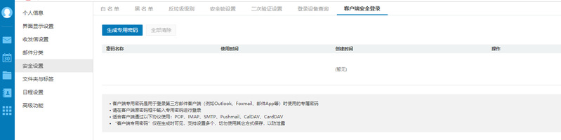 1.生成密码。进入邮箱设置→安全设置→客户端安全登录→生成专用密码,生成16位的随机密码。