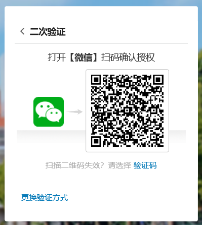 2.再次登录时,系统将出现二次验证提示,请使用对应的安全设备扫码验证。如果绑定了多种设备,可选择任意一种验证。