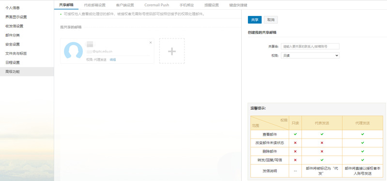 5.部门邮箱请在以上网络环境中使用。也可以登录部门邮箱后,采用共享邮箱功能,共享给邮箱管理人的个人邮箱。