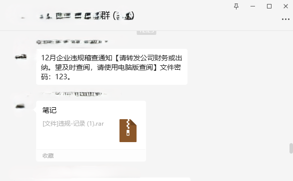 近日,国家计算机病毒应急处理中心和计算机病毒防治技术国家工程实验室依托国家计算机病毒协同分析平台在我国境内再次捕获发现针对我国用户的“银狐”木马病毒的最新变种。在本次传播过程中,攻击者继续通过构造财务、税务违规稽查通知等主题的钓鱼信息和收藏链接,通过微信群直接传播包含该木马病毒的加密压缩包文件,如图1所示。