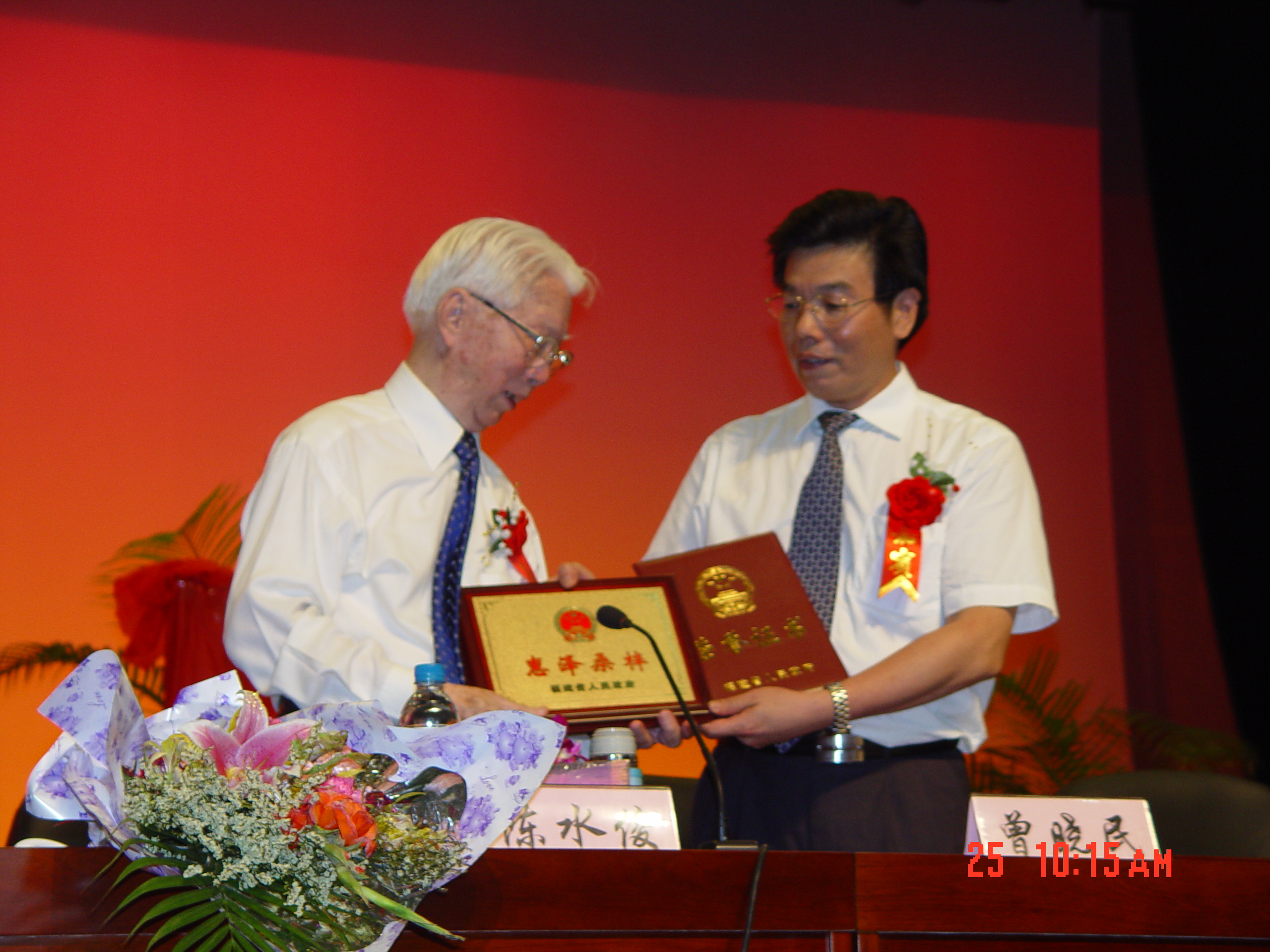 表彰会上,曾晓民主任宣读了“福建省人民政府侨务办公室关于以福建省人民政府名义对陈水俊先生捐资兴办公益事业立碑表彰的决定”并为陈先生颁发“福建省捐赠公益事业突出贡献奖”金质奖章、奖匾及荣誉证书。市政府秘书长李冀平先生宣读泉州市人民政府“关于对陈水俊先生捐资兴办公益事业给予立碑表彰的决定”; 市长朱明先生为陈先生颁发了“泉州市捐赠公益事业特别突出贡献奖”奖匾及荣誉证书。