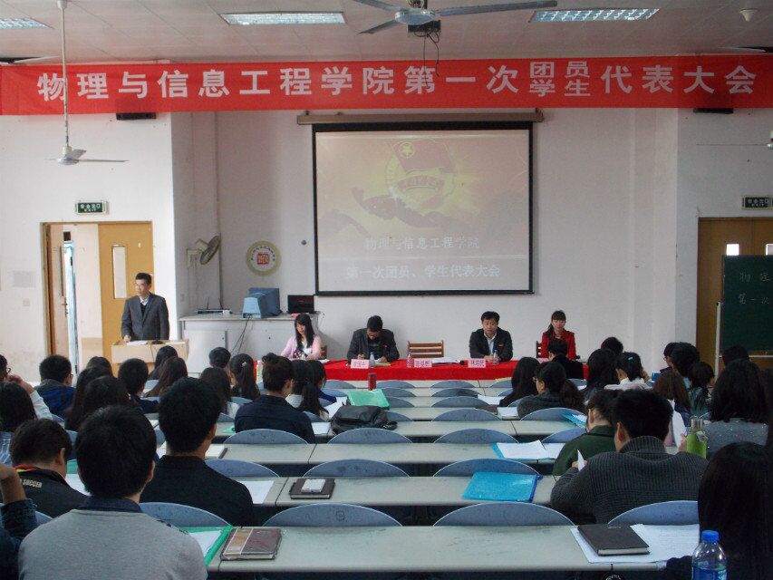 2015年3月28日上午,物理与信息工程学院第一次团员、学生代表大会在理工楼218隆重召开。学院党委书记陈晏辉、团委学生科负责人林端民、各专业辅导员老师、院团学代表及化生学院学生代表共140余人参加了大会。会议由学生科章国中老师主持。林端民老师致开幕词。