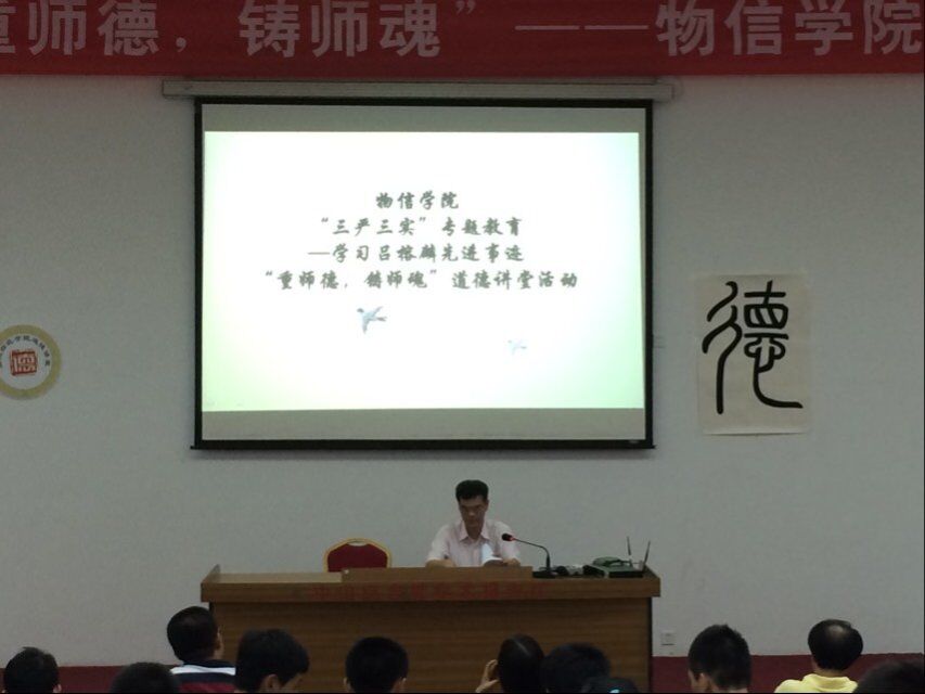为了进一步弘扬高尚师德,切实担负起教书育人的重任,以良好的师德形象教育学生,按照院党委的安排,6月18日下午我院在中山礼堂第一学术报告厅,开展学习吕榕麟先进事迹“三严三实”专题教育暨“重师德,铸师魂”为主题的道德讲堂活动,学院全体教职工和师范生200余人参加了此次活动。