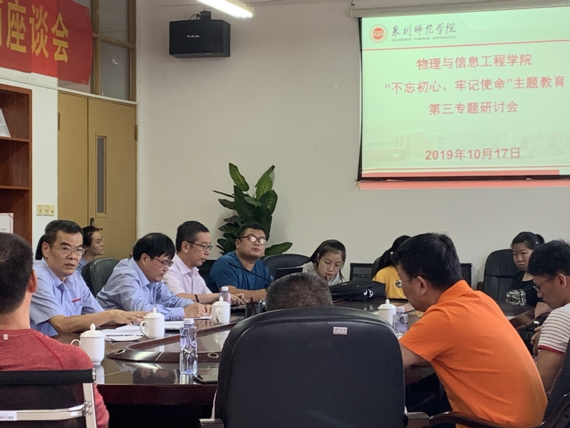 2019年10月17日下午,在前面自学的基础上,我院在理工楼208会议室召开“不忘初心、牢记使命”主题教育第三专题研讨会暨征求师生党员意见会。学院全体师生党员参加会议,校主题教育巡回指导组黄桂程同志莅临指导。